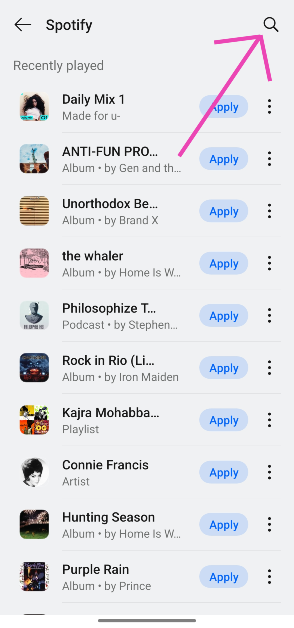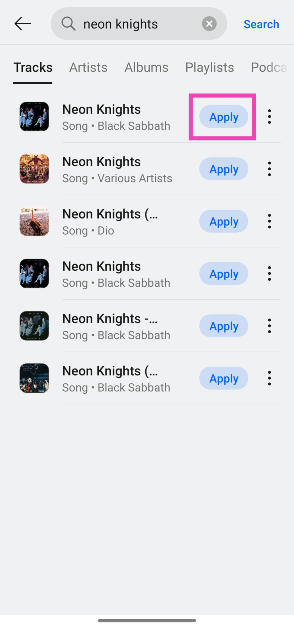 Schritt 6:Schlagen Sie dieSuchsymbolin der oberen rechten Ecke des Bildschirms, um nach einem Lied zu suchen. Alternativ können Sie auch schlagenAnwendenneben einem vorgeschlagenen Lied, um es als Alarm festzulegen.