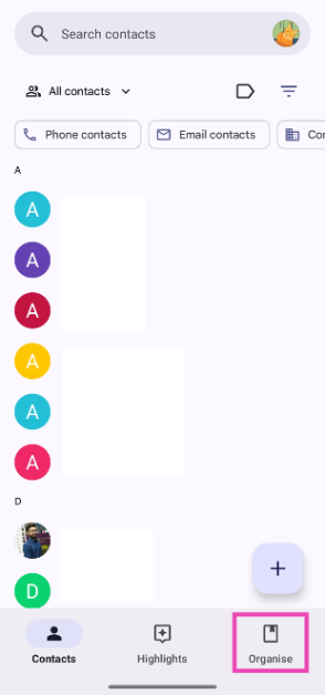 Der Papierkorb in Google Kontakte befindet sich auf der Registerkarte „Organisieren“.