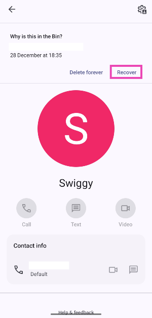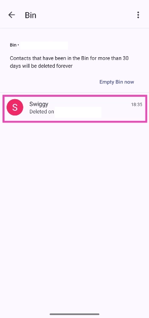 Wenn Sie ein Android-Telefon verwenden, ist die Google-Kontakte-App wahrscheinlich die native Telefonbuch-App auf Ihrem Telefon. Nur eine Handvoll OEMs verfügen noch über eine eigenständige Kontakt-App. Das Wiederherstellen einer gelöschten Telefonnummer in der Google Kontakte-App bringt einen wichtigen Haken mit sich: Der Kontakt muss in Ihrem Google-Konto gesichert werden. Kontakte, die auf Ihrem Gerät gespeichert sind (ohne gesichert zu werden), werden endgültig gelöscht, wenn Sie auf das Papierkorbsymbol klicken. Nur die gesicherten Kontakte werden in den Ordner „bin“ verschoben.