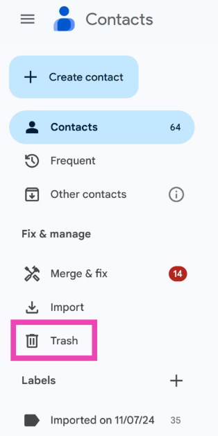 Gehe zuGoogle Contacts>Organise>Binund wählen Sie die Telefonnummern aus, die Sie wiederherstellen möchten.