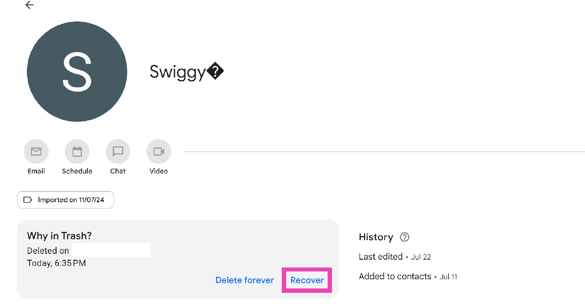 Öffnen Sie das Webportal „Google Kontakte“ auf Ihrem PC, tippen Sie auf „Papierkorb“, wählen Sie einen Kontakt aus und klicken Sie auf „Wiederherstellen“.