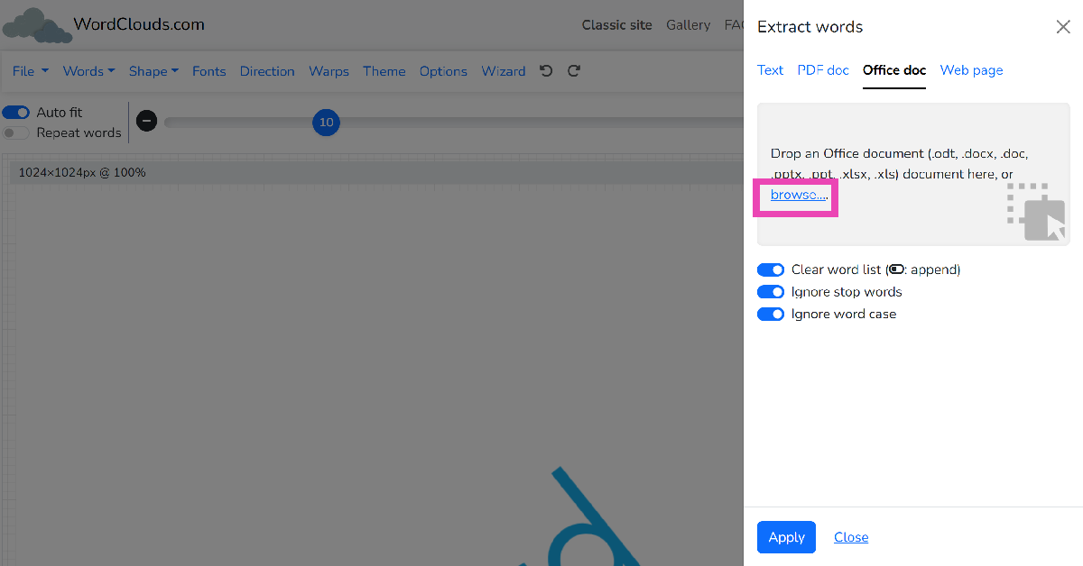 Schritt 2:Klicken Sie aufWorteund auswählenExtrahieren Sie Wörter aus einem Office-Dokument. Sie können auch Text aus der Zwischenablage einfügen.