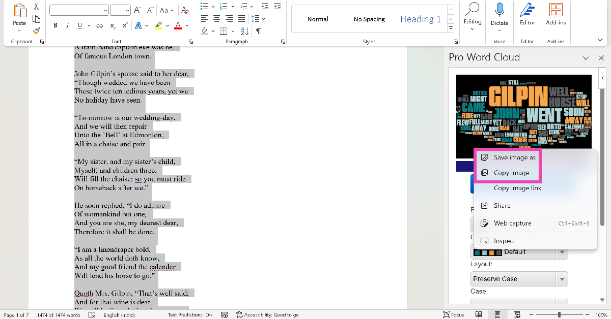 Klicken Sie auf der Registerkarte „Startseite“ auf „Add-Ins“ und wählen Sie das Pro Word Cloud-Tool aus. Markieren Sie den Text im Dokument und klicken Sie auf „Wortwolke erstellen“.
