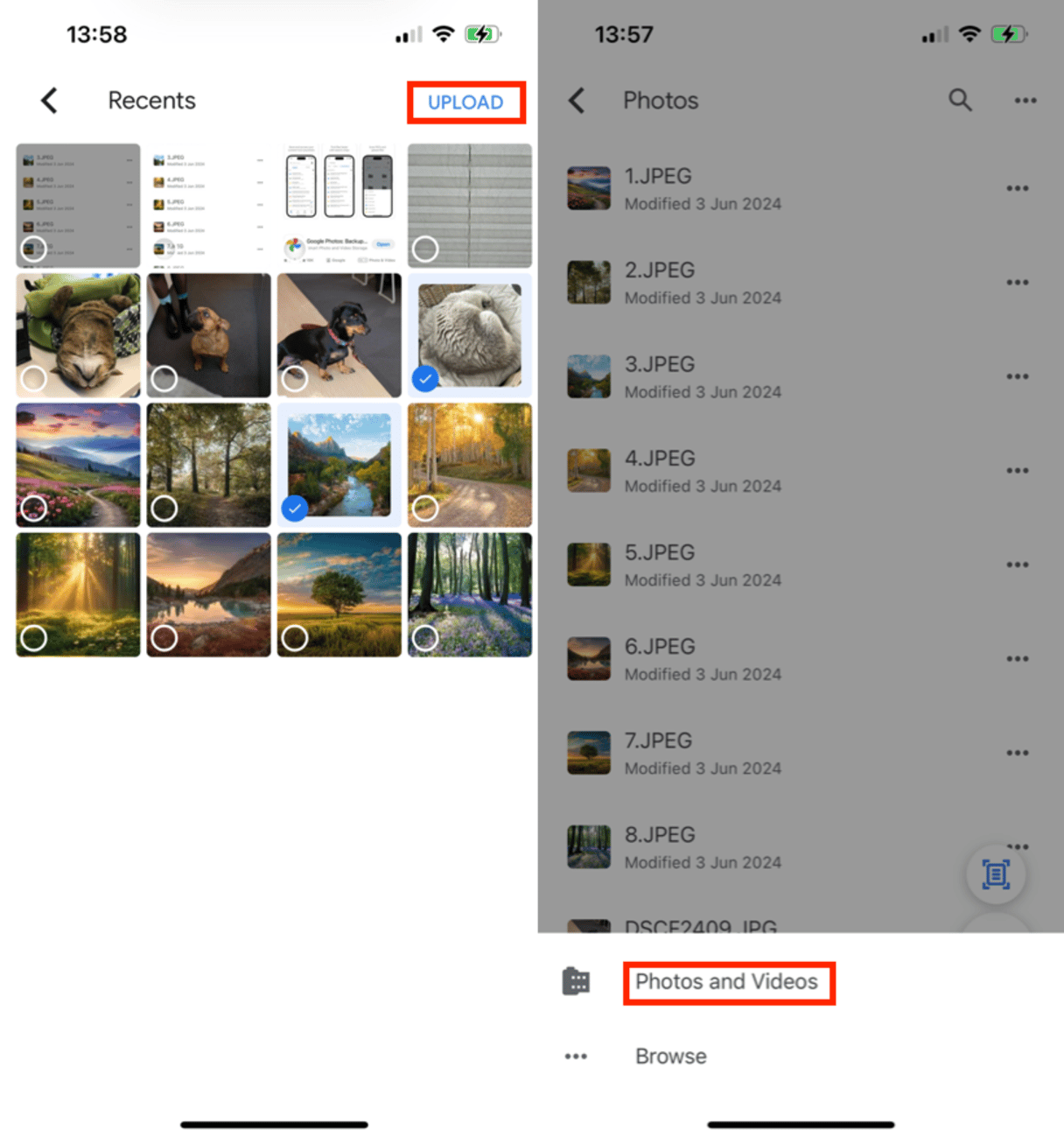- Wählen Sie „Hochladen“ und dann „Fotos und Videos“.