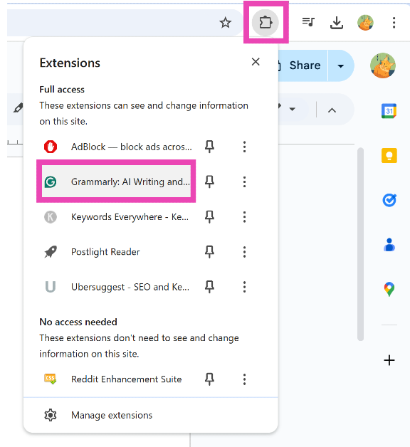 Klicken Sie auf das Erweiterungssymbol, klicken Sie auf Grammarly und aktivieren Sie den Kippschalter neben „Auf [aktueller Website] nach Schreibvorschlägen suchen“.