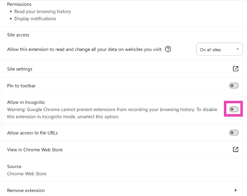 Schritt 3:Schalten Sie den Kippschalter daneben einInkognito zulassen.