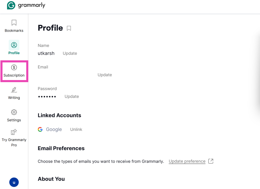 Schritt 1:Gehen Sie zu GrammarlyKontoverwaltungsseite.