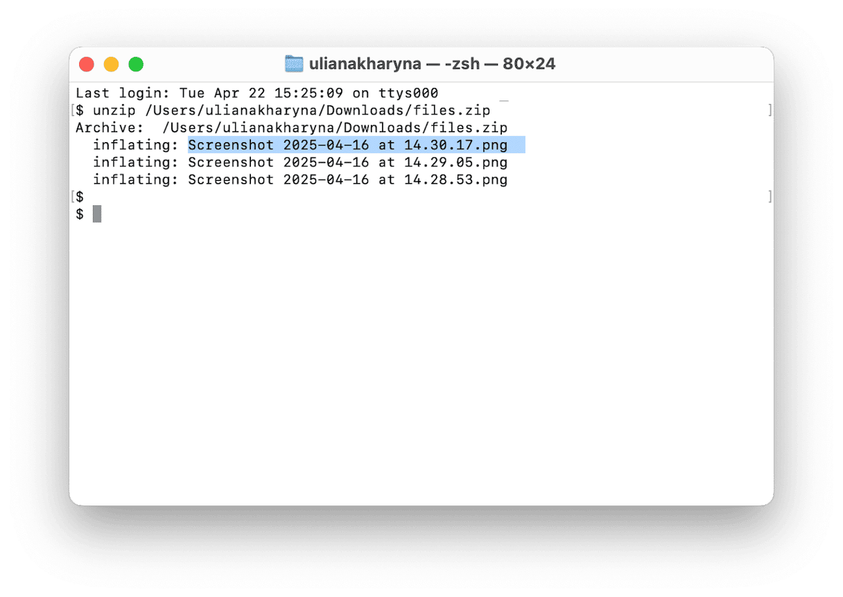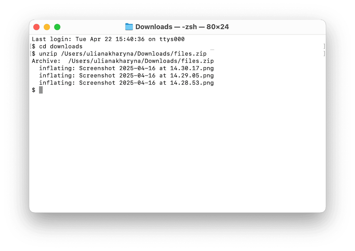 Wenn Sie es an einem bestimmten Ort haben möchten, geben Sie Folgendes eincdgefolgt vom Namen dieses Speicherorts, bevor Sie es ausführenunzipBefehl. Geben Sie zum Beispiel Folgendes ein:cd desktopgefolgt von Return, wenn Sie es auf dem Desktop dearchivieren möchten odercd downloadswenn Sie diese Dateien im Ordner „Downloads“ benötigen. Führen Sie dann den Befehl aus.