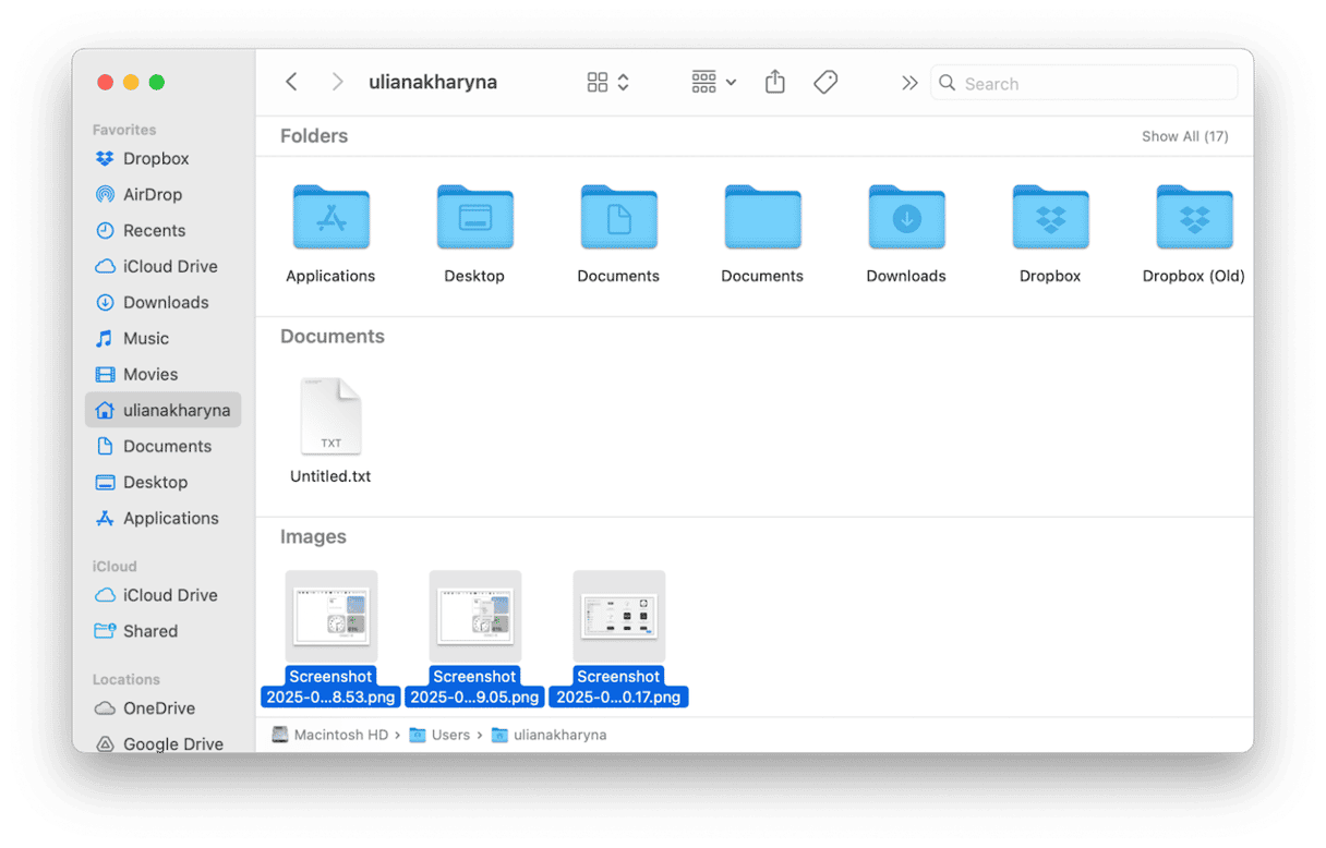 Wie Sie sehen, besteht eine effektive Möglichkeit, Speicherplatz freizugeben, darin, Dateien zu entfernen, die Sie längere Zeit nicht geöffnet haben, und diejenigen zu archivieren, die den meisten Speicherplatz beanspruchen. Das Problem dabei ist, diese Dateien zu identifizieren. Haben Sie wirklich Zeit, alle Dateien auf Ihrem Startvolume zu durchsuchen und die Dateigrößen und das Datum der letzten Änderung zu überprüfen? Zum Glück gibt es eine viel einfachere Möglichkeit, diese Dateien zu finden – verwenden Sie die My Clutter-Funktion von CleanMyMac. Es gibt ein Tool namens Large & Old Files, das nach dem Scannen Ihres Startvolumes alle diese Dateien auflistet. Sie können sie dann nach Größe oder Datum sortieren und diejenigen markieren, die Sie löschen möchten (denken Sie daran, eine Kopie auf einer externen Festplatte zu erstellen, wenn Sie sie nicht verlieren möchten). Es kann auch ähnliche Bilder und doppelte Dateien identifizieren.