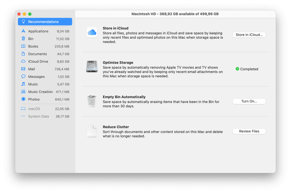 Gehen Sie zum Apple-Menü und wählen Sie „Über diesen Mac“ > „Weitere Informationen“. Wählen Sie Speichereinstellungen. Im erscheinenden Fenster sehen Sie einige nützliche Vorschläge. Mit „In iCloud speichern“ können Sie alle Ihre Daten in den Cloud-Speicher übertragen und einige GB auf Ihrem Mac zurückgewinnen. Mit der zweiten Option können Sie die umfangreichsten Dateien wie Filme und Apps löschen.