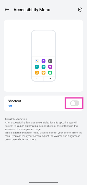 Gehe zuEinstellungen > Zusätzliche Einstellungen > Barrierefreiheit > Barrierefreiheitsmenü > Verknüpfungund schalten Sie den Kippschalter ein. Tippen Sie auf dem Bildschirm auf das Barrierefreiheitssymbol, klicken Sie auf die Kachel „Ein/Aus“ und wählen Sie „Neustart“.