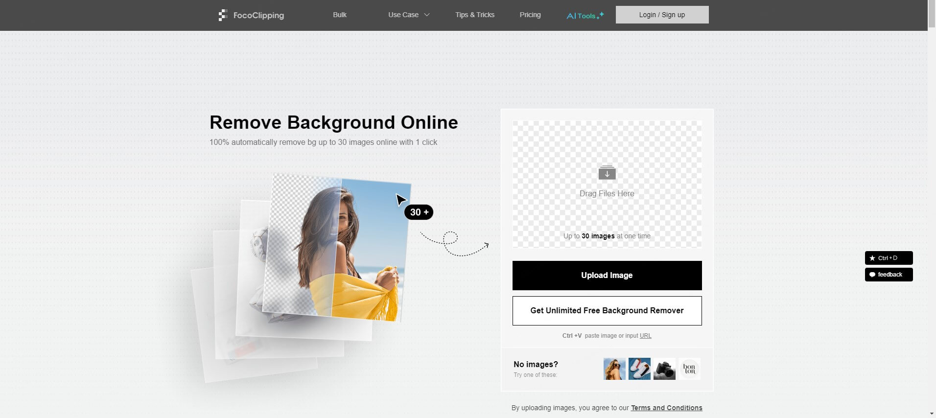 Klicken Sie aufEntfernen Sie den Hintergrund von ImaeOption zum Hochladen Ihrer Bilder oder zum direkten Ablegen der Fotodateien im Datei-Upload-Bereich. Sie können 1–10 Bilder gleichzeitig hochladen oder ablegen.