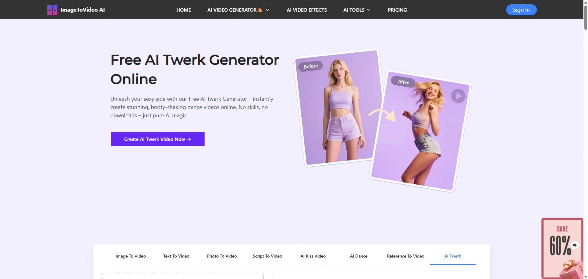 Für Benutzer, die ein wirkliches suchenKostenloser AI-Twerk-Videogenerator,ImageToVideo AIbietet unbegrenzte HD-Videoexporte ohne Wasserzeichen. Es ist für den mobilen Einsatz optimiert und erfordert keine Anmeldung.