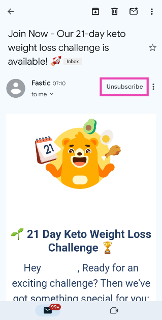 Da Google diese Funktion immer noch schrittweise einführt, kann es einige Zeit dauern, bis sie auf Ihrem Gerät verfügbar ist. Stellen Sie sicher, dass Sie die aktualisierte Version der Gmail-App verwenden. In der Zwischenzeit können Sie sich von einer Mailingliste abmelden, indem Sie zum Ende der E-Mail scrollen und auf „Abbestellen“ tippen.