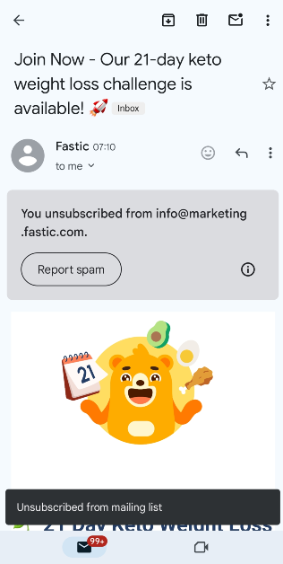 Das Tippen auf die Schaltfläche zum Abbestellen kann zwei Dinge bewirken. Sie werden entweder zur Website/App des Absenders weitergeleitet, um den Vorgang abzuschließen, oder Gmail entfernt Sie von der Mailingliste, ohne die App zu verlassen. Letzteres funktioniert für Dienste, die eine E-Mail-Anfrage zum Abbestellen ihrer Updates verlangen. Gmail erstellt und versendet diese E-Mail automatisch in Ihrem Namen.