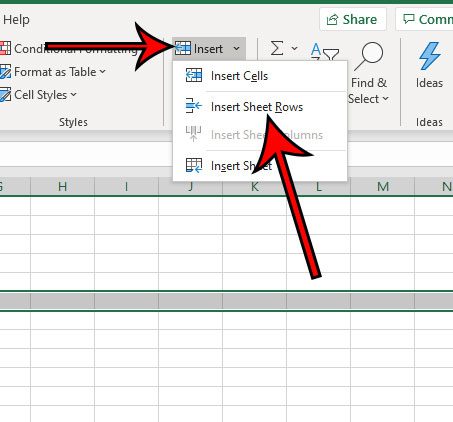 Alternativ können Sie eine neue Zeile hinzufügen, nachdem Sie den Einfügepunkt ausgewählt haben, indem Sie auf klickenHeimKlicken Sie oben im Fenster auf die Registerkarte und klicken Sie dann aufEinfügenSchaltfläche in derZellenAbschnitt des Menübands und wählen Sie die ausBlattzeilen einfügenOption.