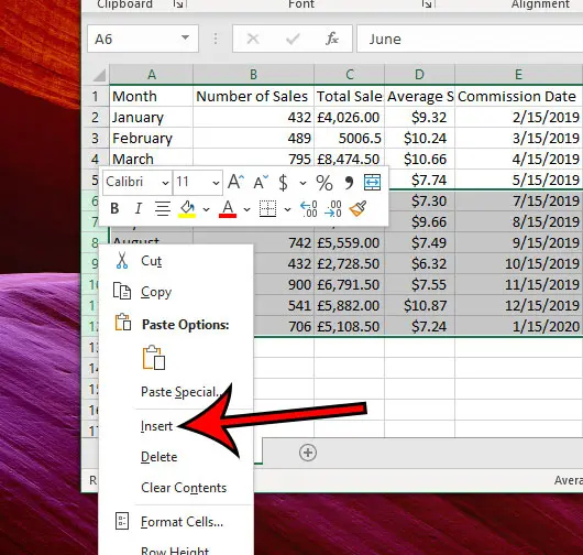 Weiter unten finden Sie in unserem Leitfaden weitere Informationen zum Einfügen einer Zeile in Excel 2016, einschließlich Bildern dieser Schritte.