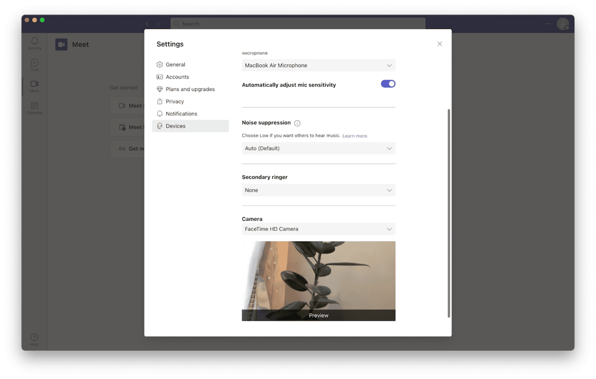 Wenn Sie mehr als eine Kamera an Ihren Mac angeschlossen haben – vielleicht die integrierte FaceTime-Kamera und eine USB-Webcam – möchten Sie entscheiden, welche Sie verwenden möchten. Die meisten Apps, einschließlich Zoom und Teams, verfügen über Einstellungssteuerelemente, die einen Abschnitt für Video und Audio enthalten. Hier können Sie sowohl die Kamera als auch das Mikrofon auswählen und in der Regel testen, die Sie verwenden möchten. Sie können diese Einstellungen auch verwenden, um die Position der Kamera so anzupassen, dass sie in die gewünschte Richtung zeigt, da eine Vorschau des Bildes angezeigt wird.
