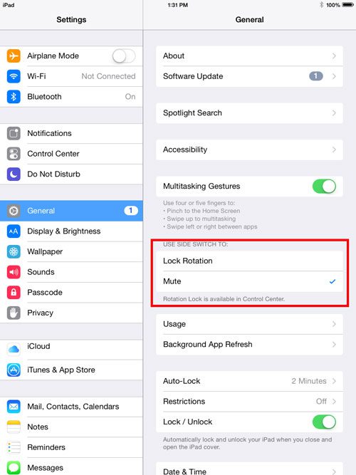 - Schritt 3: Suchen Sie dieVerwenden Sie den Seitenschalter, umAbschnitt auf der rechten Seite des Fensters und wählen Sie dann entweder den ausDrehung sperrenOption, wenn Sie möchten, dass der Seitenschalter das iPad im Hochformat sperrt, oder wählen Sie die Option ausStummOption, wenn Sie diesen Schalter zum Stummschalten des Geräts verwenden möchten.