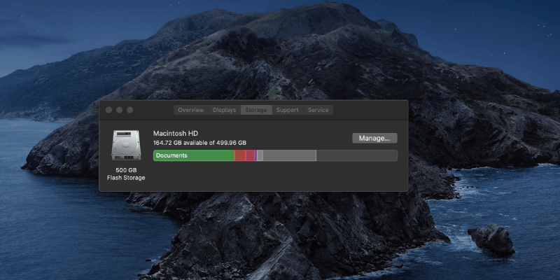 Sie sehen eine Aufschlüsselung der Dateien auf Ihrem Mac. Der Bereich mit den grauen diagonalen Linien sollte „Löschbar“ anzeigen, wenn Sie mit der Maus darüber fahren, und Ihnen sagen, wie viel Speicherplatz diese Dateien beanspruchen.