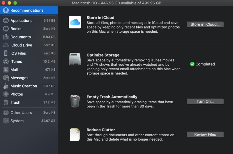 Aufgrund der Funktionsweise der Funktion zum Löschen von Speicherplatz entfernt Ihr Mac diese Elemente nur, wenn kein anderer Speicher mehr vorhanden ist. Dies geschieht automatisch. Sie können diese Dateien nicht manuell bearbeiten, es sei denn, Sie möchten iTunes-Filme aus Ihrer Bibliothek löschen oder alte E-Mails loswerden (das sind die Dateitypen, die Ihr Mac ohnehin automatisch für Sie verwaltet).