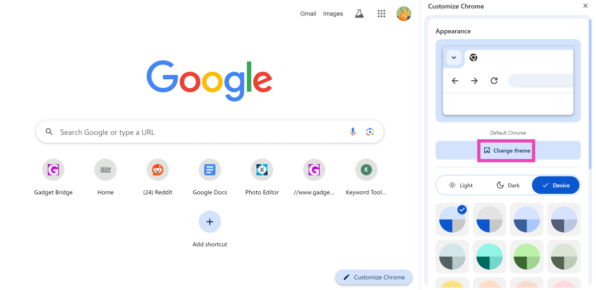 Eine Möglichkeit, diese Einschränkung zu umgehen, besteht darin, eine Eingabeaufforderung an einen KI-Bildersteller zu senden und das beste Ergebnis auf Ihrem PC zu speichern. Gehen Sie dann zum Anpassungsbereich in Chrome, wählen Sie die Option zum Ändern des Themas und laden Sie das AI-Bild hoch. Obwohl dieser Vorgang möglicherweise mehr Aufwand erfordert, haben Sie eine bessere Kontrolle darüber, wie Ihr Webbrowser aussieht.