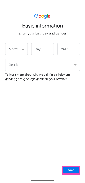 Schritt 6:Geben Sie Ihre einGeburtsdatumUndGeschlecht. SchlagNächste.