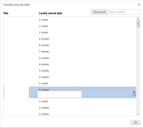 Schritt 6: Klicken Sie auf die Website, deren Cookies Sie löschen möchten, und klicken Sie dann auf dieXauf der rechten Seite des Fensters.
