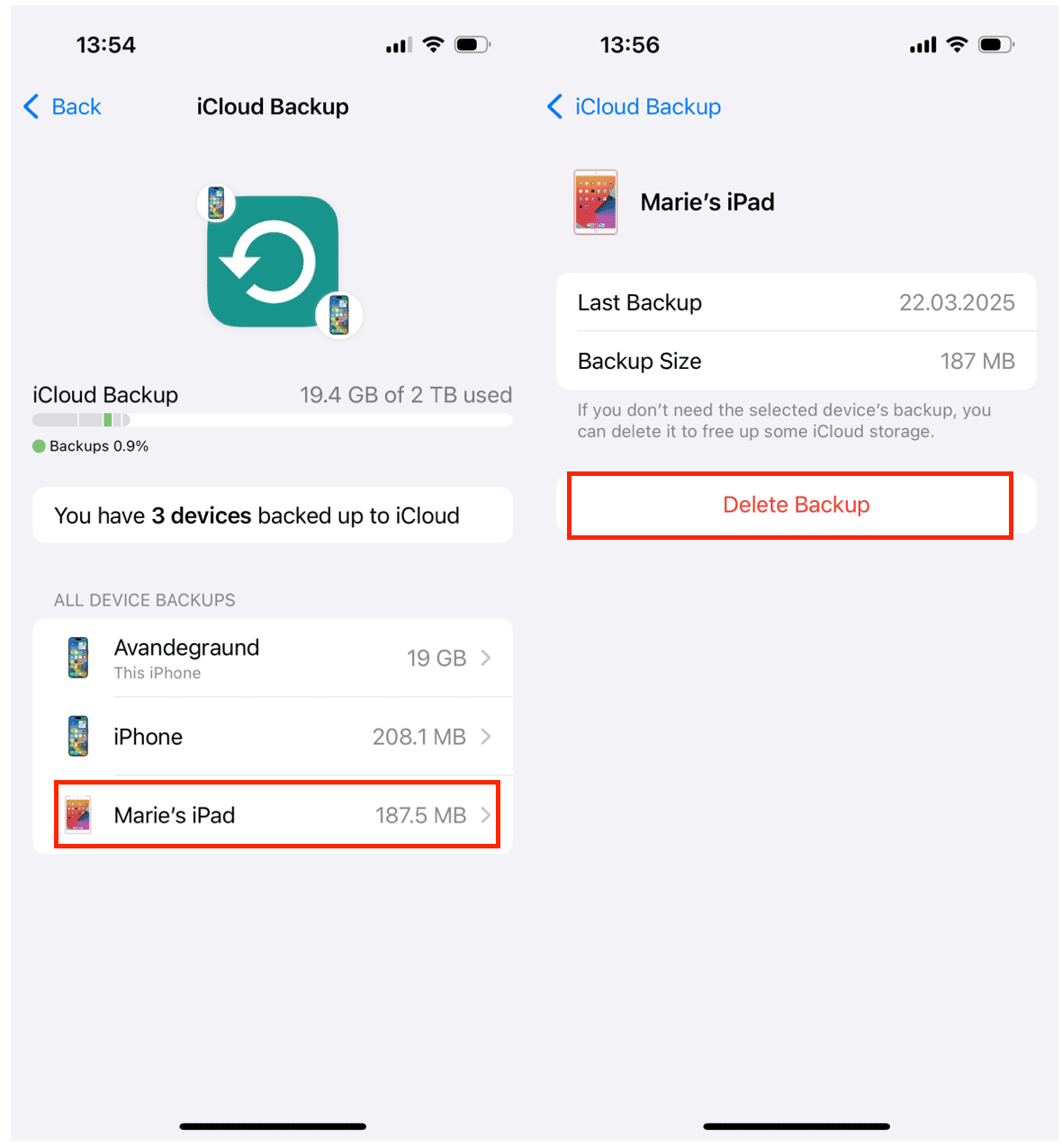 Auch hier ist der Vorgang sehr einfach, Sie werden unten sehen, wie Sie das Backup löschen. Tippen Sie einfach auf den Namen eines Geräts, dessen Backup Sie nicht benötigen.