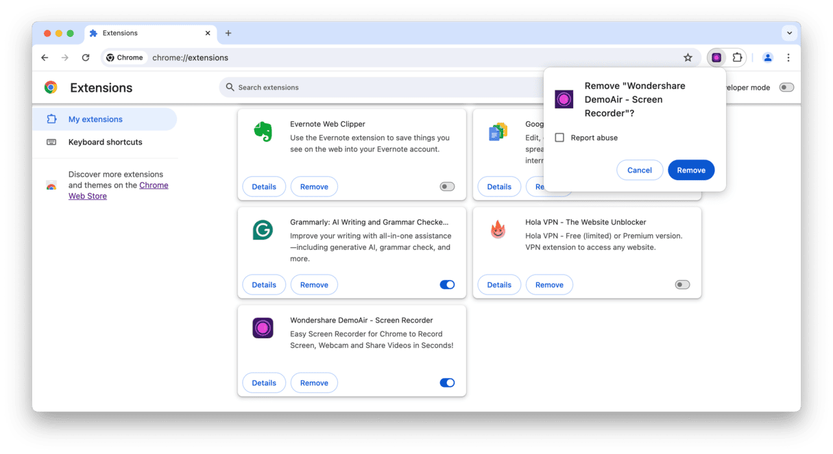 - Suchen Sie die Wondershare-Erweiterung und klicken Sie daneben auf das Auslassungssymbol > Entfernen.