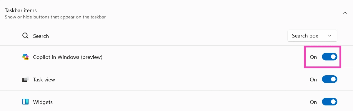 Schritt 4:Schalten Sie den Kippschalter ausKopilotunter 'Elemente der Taskleiste'.