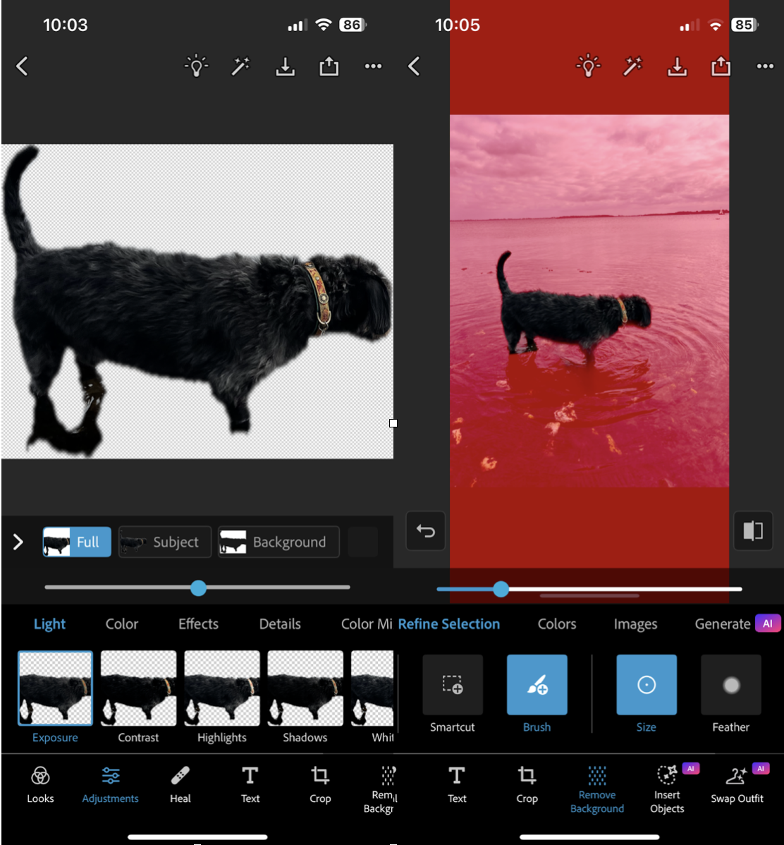 Photoshop für iPhone: Desktop-Ebenen und generative Firefly-Füllung für unterwegs. Perfekt, wenn „Clean Up“ fehlschlägt oder ich eine glaubwürdige Textursynthese für Hintergründe und Kleidung benötige.