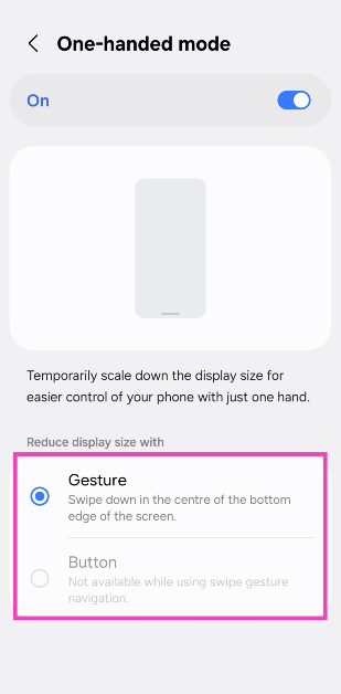 Gehe zuEinstellungen > Erweiterte Funktionenund schalten Sie den Kippschalter neben „Einhandmodus“ ein.