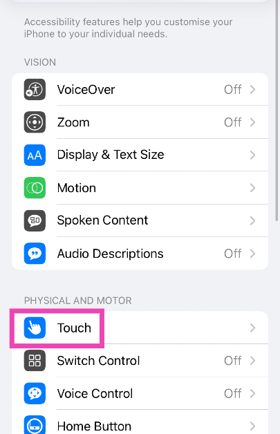 Gehe zuEinstellungen > Berührenund schalten Sie den Kippschalter neben „Erreichbarkeit“ ein.