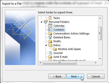 Schritt 7: Wählen Sie ausKontakteOption untenPersönliche Ordner, und klicken Sie dann aufNächsteTaste.
