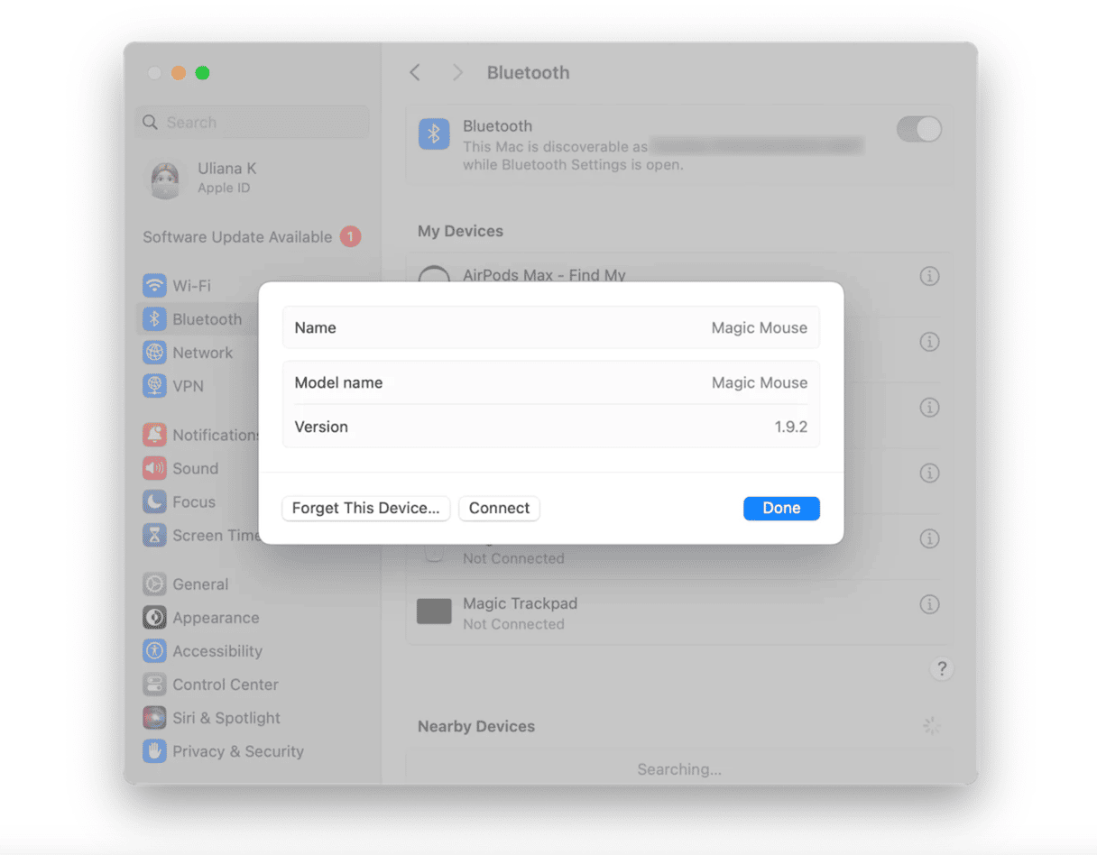 Gehen Sie zu Systemeinstellungen > Bluetooth und klicken Sie auf das „i“ neben Ihrer Maus. Wählen Sie „Dieses Gerät vergessen“. Befolgen Sie anschließend die mit Ihrer Maus gelieferten Anweisungen, um sie erneut mit Ihrem Mac zu koppeln und zu verbinden.