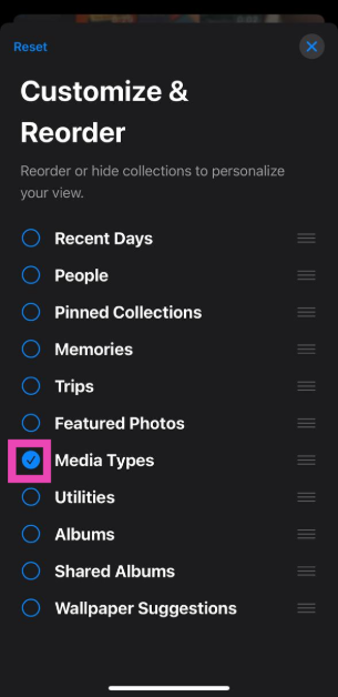 Gehen Sie zur Foto-App, tippen Sie auf die Registerkarte „Anpassen und neu anordnen“ und deaktivieren Sie alle Sammlungen außer „Medientypen“.