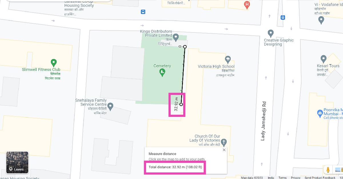 Schritt 5:Google Maps zeigt das anDistanzzwischen den beiden Punkten.