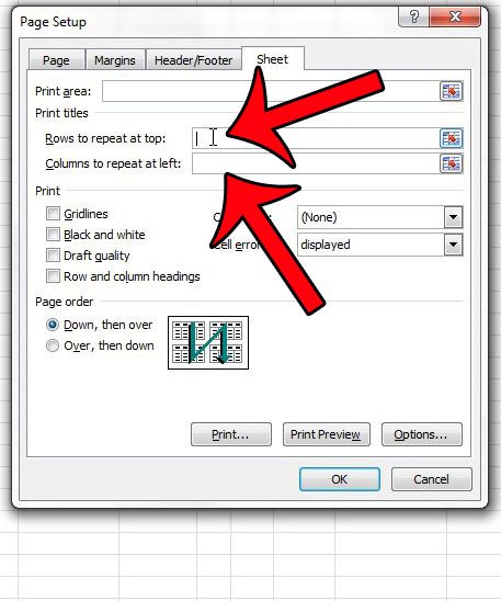 Schritt 4: Klicken Sie hineinZeilen, die oben wiederholt werden sollenFeld, wenn Sie oben auf jeder Seite eine Zeile drucken möchten, oder klicken Sie in das FeldSpalten zur Wiederholung linksFeld, wenn Sie eine Spalte auf der linken Seite jeder gedruckten Seite wiederholen möchten.
