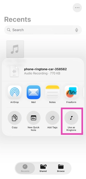Starten Sie die Datei-App, gehen Sie zur Audiodatei, drücken Sie lange auf die Datei, tippen Sie auf „Teilen“ und wählen Sie „Als Klingelton verwenden“. Diese Methode erfordert ein Update Ihres iPhones auf iOS 26.