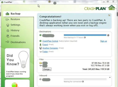 Dies ist einer der Aspekte des Backup -Assistenten von CrashPlan, der mich so ansprechend ist. Ich liebe es, nicht aktiv über meine Backup -Aktivitäten nachdenken zu müssen, und es ist schön zu haben, was eine Assistent -Backup -Erinnerung ist, die mich daran erinnert, dass alle neuen Daten, die ich in den letzten Tagen generiert habe, dem Datenverlust ausgesetzt sein könnten.