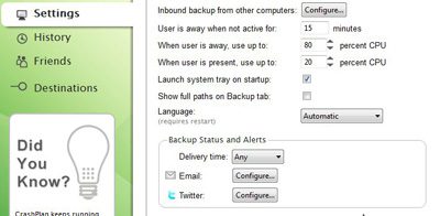 CrashPlan führt die Sicherung durch, wenn das externe Laufwerk mit dem Computer verbunden ist, und es senden Ihnen sogar eine E -Mail, wenn das Laufwerk seit einiger Zeit nicht mehr angeschlossen ist.