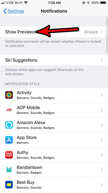 Obwohl es immer möglich war, die Anzeige dieser Vorschauen zu beenden, gibt es keine Möglichkeit, die Anzeige dieser Vorschauen für jede Benachrichtigung auf Ihrem iPhone schnell zu beenden. Unser Tutorial unten zeigt Ihnen, wo Sie diese Einstellung finden und wie Sie sie anpassen können.