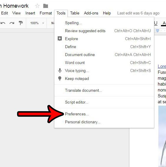 Nachdem Sie nun unsere Anleitung zum Deaktivieren der automatischen Formatierung in Google Docs ausgefüllt haben, finden Sie das Menü, das die verschiedenen Einstellungen steuert, mit denen Google Docs bei der Eingabe seine eigene Formatierung anwendet.