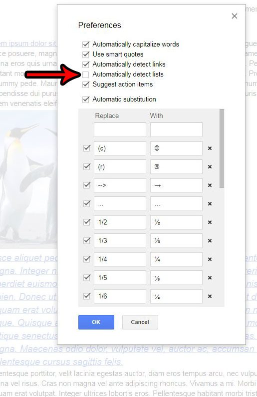 Schritt 3: Deaktivieren Sie das Kontrollkästchen links davonListen automatisch erkennen, und klicken Sie dann aufOKSchaltfläche am unteren Rand des Fensters.
