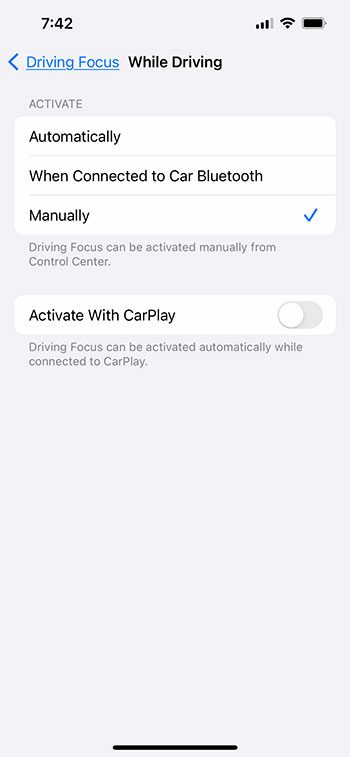- Während der Fahrt – Wenn Sie diese Option auswählen, gelangen Sie zu einem anderen Bildschirm, auf dem Sie auswählen können, ob sich der Fahrfokus automatisch einschalten soll, wenn eine Bluetooth-Verbindung zum Auto besteht, manuell oder Sie können ihn mit CarPlay aktivieren.