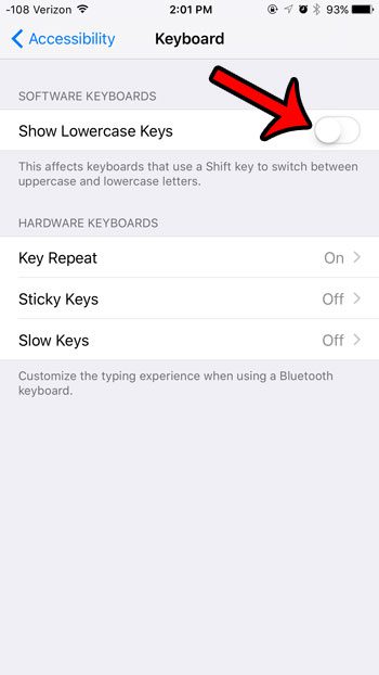 Schritt 5: Tippen Sie auf die Schaltfläche rechts danebenKleinbuchstaben anzeigenum es auszuschalten. Sie erkennen, dass die Funktion ausgeschaltet ist, wenn um die Schaltfläche herum keine grüne Schattierung zu sehen ist. Die Kleinbuchstabentasten der Tastatur sind in den Bildern unten deaktiviert.