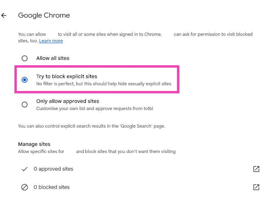Gehen Sie zu Family Link und wählen Sie ausInhaltsbeschränkungen > Google Chrome > Versuchen Sie, explizite Websites zu blockieren. Sie können mit Family Link auch eine benutzerdefinierte Sperrliste für Websites erstellen.