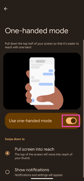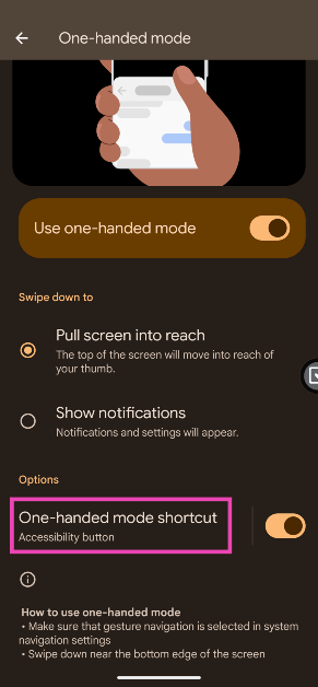 Schritt 6:Wählen Sie aus, ob Sie möchtennach unten wischenauf derNavigationsleisteum den Einhandmodus auszulösen oder den Benachrichtigungsschirm herunterzuziehen.