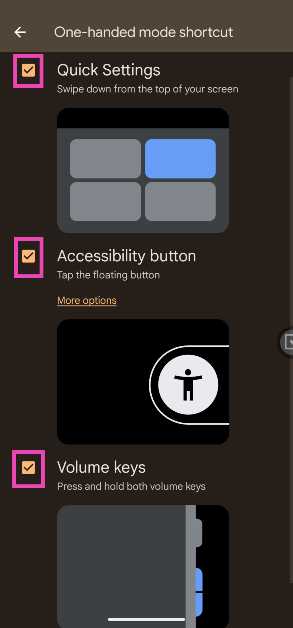 Gehe zuEinstellungen > Eingabehilfen > Systemsteuerung > Einhandmodus > Verknüpfung für den Einhandmodusund aktivieren Sie das Kontrollkästchen neben den Lautstärketasten. Halten Sie beide Lautstärketasten gedrückt, um in den Einhandmodus zu wechseln.